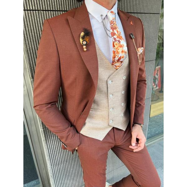 Brown Groom 3pc Tuxedo Suit Mono Collar Slim Cut For New Season Images |